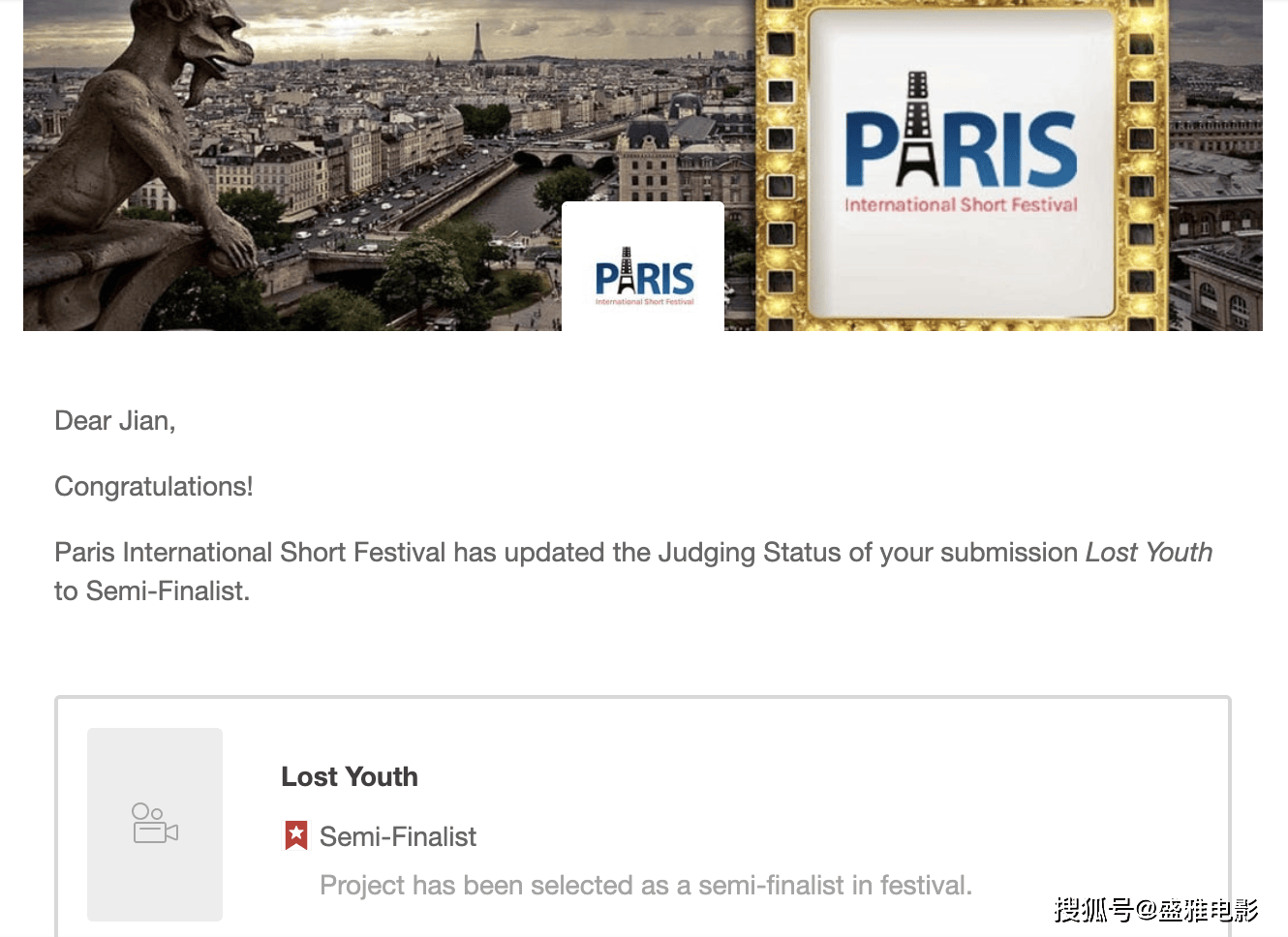 由曹剑编剧并执导、北京盛雅文化传媒有限公司出品的现实主义短片《消逝的少年》(Lost Youth),近日进入 Paris International Short Film Festival 半决赛评选阶段(Semifinalist),纳入该电影节的官方评审体系。