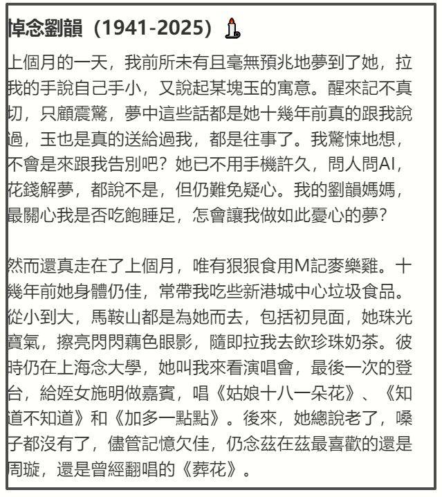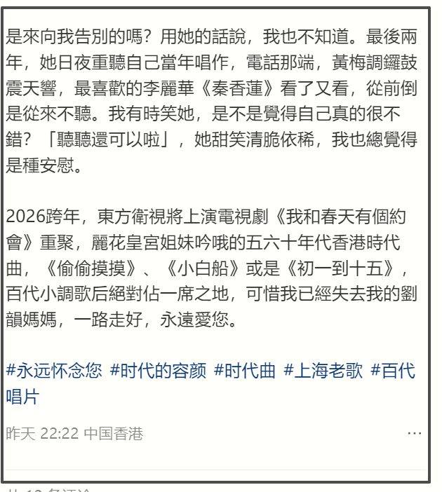 刘韵的离世,标志着香港乐坛一段小调传奇的落幕。她凭借《姑娘十八一朵花》成名,以婉转动人的唱腔获得小调歌后的美誉,并与双胞胎姐姐夏丹共同闪耀在香港乐坛初期。晚年深居简出,失智后仍惦念友人、细心准备后事,生命的最后两年,她反复重温自己的作品与经典剧目。如今,跨年晚会的旋律再次响起,但歌声的主人已不在,只留下乐坛与听众的无尽唏嘘与怀念。