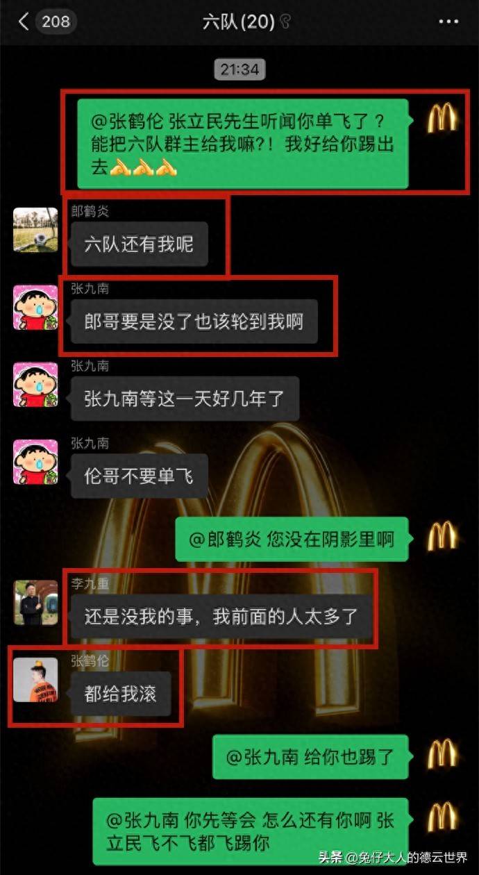 12月30日,『德云社』六队的群聊内容被曝光,里面出现了庄子建、郎鹤炎、张九南和李九重四人争抢队长职务的情况。他们纷纷拿自己的资历与彼此比较,场面仿佛回到了几年前的那个时候。到底为何会突然争起队长这个职务呢?原来是有人散布了关于张鹤伦退出『德云社』并单飞的谣言。队员们对于这件事感到困惑,纷纷想要弄清楚事情的真相。如果这只是谣言,他们希望队长能出来澄清一下;但如果是真的,那就必须尽快找到新的队长,因为六队不能没有领导者。这些队员们争抢队长位置的举动,引发了张鹤伦的愤怒,他当场爆粗口,显然很生气。