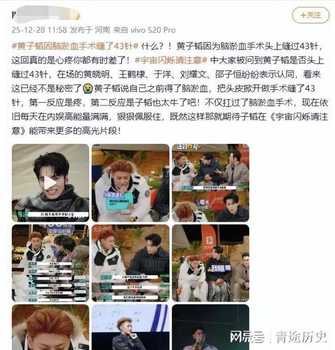 『黄子韬』最近在参加综艺节目《宇宙闪烁请注意》时,随口提到了一些自己的过往经历,结果引发了热搜,仿佛一部医学纪录片。节目中,当『黄晓明』、『王鹤棣』等嘉宾确认『黄子韬』头部曾缝过43针的传闻时,镜头前的『黄子韬』笑得灿烂,好像在聊别人的家常。他开始讲起自己六岁时的那次开颅手术,事情起因是小时候习武时意外摔倒,脑部淤血没有及时排出,最终不得不进行开颅取血手术。手术时医生取下了他的部分头骨,清除淤血后又重新把骨头盖回去。