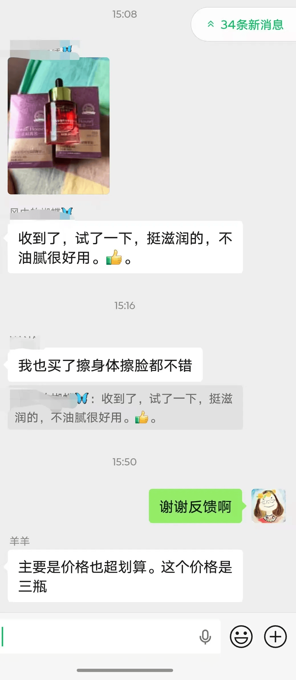 这款玫瑰精油,擦脸的,还可以擦身体、擦头发,价格非常划算。国产货,成份也很实在,任何肤质都可以用,0刺激。