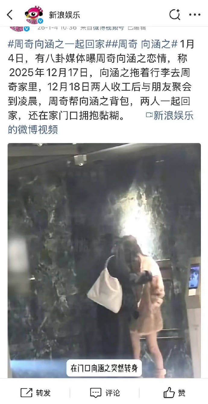 2026年1月刚刚开始,司晓迪就发布了多个爆炸性的『娱乐圈』️八卦,让人目不暇接。新年的瓜竟然这么劲爆,令人意外。各种离奇事件接连不断,从骚扰女星、隐婚生子到负债650万,每一个都让人大跌眼镜👓。这是怎么回事呢? 『娱乐圈』️的恋情曝光,一直是粉丝和观众们最喜欢的八卦之一,无论是恋爱、结婚还是生子,总有些人选择低调,想避免公众的关注。然而,粉丝们对这些私生活的好奇心从未减弱。1月4日,狗仔放出了男星周奇和女星向涵之的亲密视频,疑似恋情被曝光。