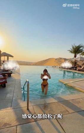 此外,『伊能静』还趁着日落余晖,在沙漠中拍下了几张美照。她头上披着丝巾,展现出浓郁的异国风情。接着,她换上泳装,在与沙漠相接的无边际泳池中尽情玩水。她描述说,在沙漠与水源这两种极端元素的结合下游泳,给她带来了与众不同的体验,身心都得到了极大的放松。她还幽默地表示:连游泳都变得特别浪漫。