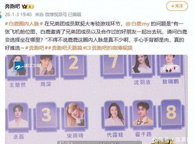 简单说一下这件事:节目里安排了一个默契考验,要『白鹿』从模拟的舱位图中选出她的朋友座位。当这张座位图一展示出来,我简直被震惊了:不仅有『李晨』、『郑恺』这些跑男兄弟团成员,还有和她合作过的演员『虞书欣』、敖瑞鹏,甚至还有综艺搭档『范丞丞』、『曾舜晞』、『宋雨琦』,简直把半个『娱乐圈』️都集合到一起了! 『白鹿』选座位时简直是纠结万分,时不时犹豫要选哪个座位,最后她决定坐在『范丞丞』和『曾舜晞』中间,还赶紧补充一句和雨琦一样亲,怕不小心得罪人。网友们看到这一幕都笑翻了,纷纷表示:看这张座位图,简直能看出『白鹿』的人脉有多强。