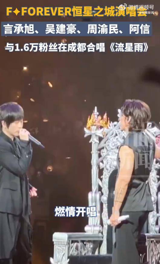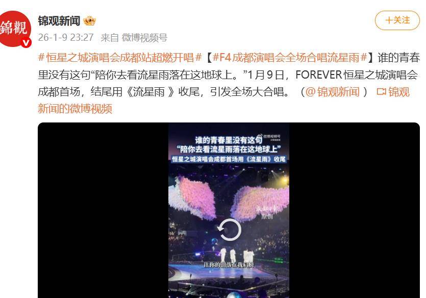 1月9日晚,成都五粮液文化体育中心综合体育馆内,1.6万支荧光棒随着《流星雨》的前奏齐齐点亮,汇成一片摇曳星海。舞台中央,言承旭、吴建豪、周渝民(F3)与五月天阿信以组合“FFOREVER”之姿并肩而立,当“温柔的星空,应该让你感动……”的熟悉旋律响起,全场观众自发起立跟唱,声浪几乎掀翻场馆穹顶——这场名为“FFOREVER恒星之城”的巡演成都首站,以最经典的方式将氛围推至沸点。