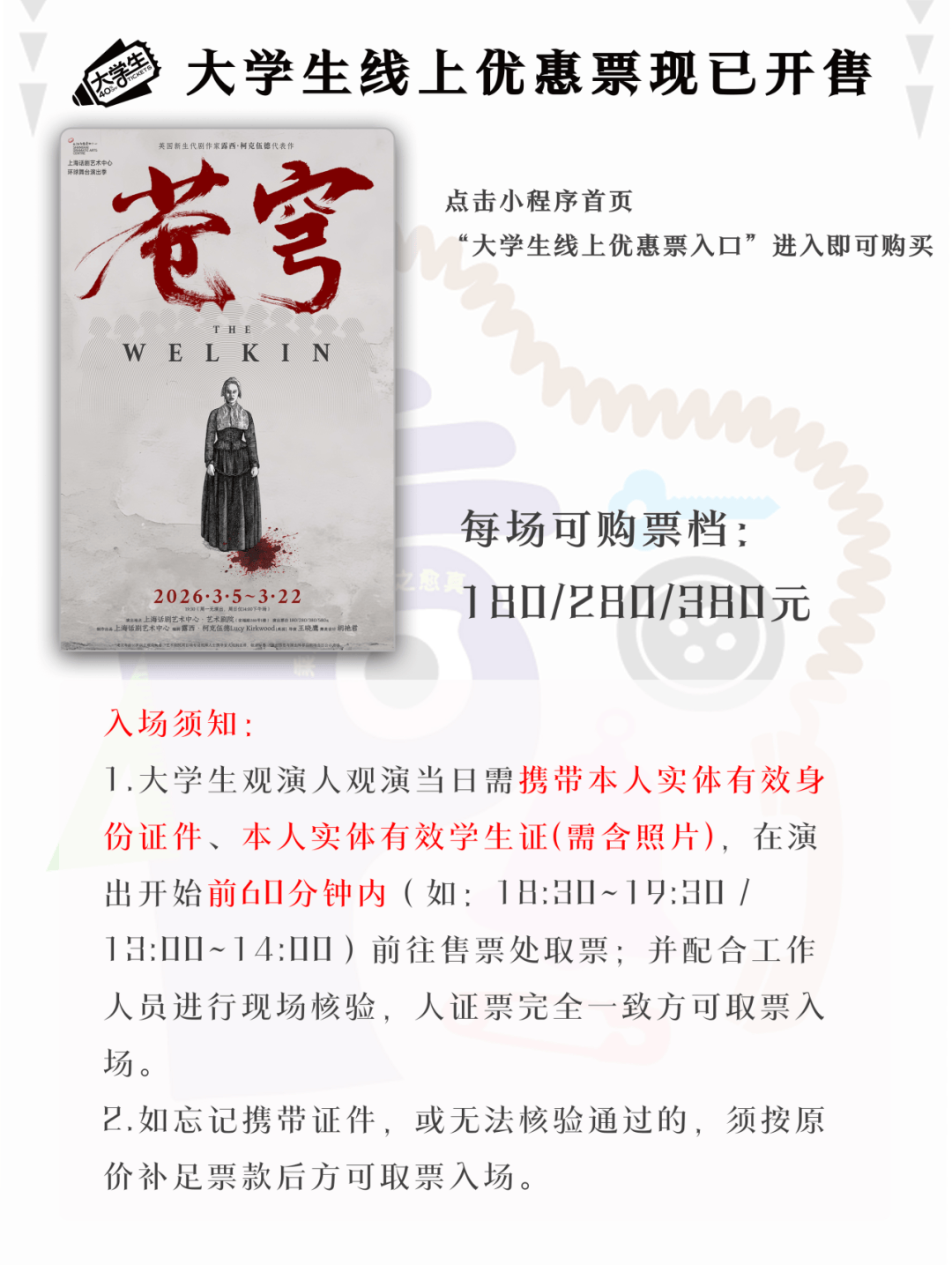 演出时间:2026.3.5-2026.3.22 19:30(周一无演出,周日仅14:00下午场)