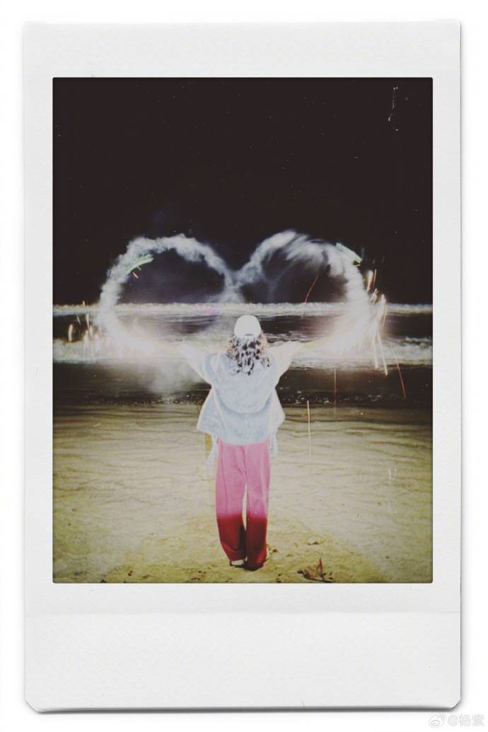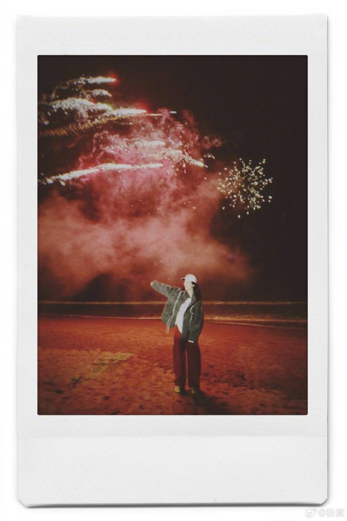 另一张照片中,她背对着镜头站在烟花下,烟火的光辉温暖地照亮她的影子,爆炸的光芒把她的轮廓映衬得柔和。在剧组拍摄夜戏时,灯光是严格按照剧本的要求来布置的,每一束光都与演员的动作配合得天衣无缝,连影子的长度也经过精心调控;然而,这次海南的烟花是没有剧本安排的自然温暖,她站在烟花下,背影显得格外自在,没有演员的站位意识,只是随意地站在光里,接住了这份温暖的光芒,完全没有任何规矩的束缚。