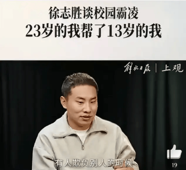 近日,徐志胜接受采访时谈及小时候经历,13岁时他多次遭高年级学生霸凌,被索要“保护费”,这让他形成深度不安全感,变成讨好型人格,还因不敢被朋友抛弃而不敢在人群中系鞋带,他称很对不起自己。这段经历还影响他考研,回忆反复侵袭,出现生理性恐惧行为。23岁时,徐志胜正视过往,与自己和解,完成对13岁自己的救赎。从13岁到23岁,校园霸凌影响他10年,好在他走出阴影,还将经历当脱口秀素材。