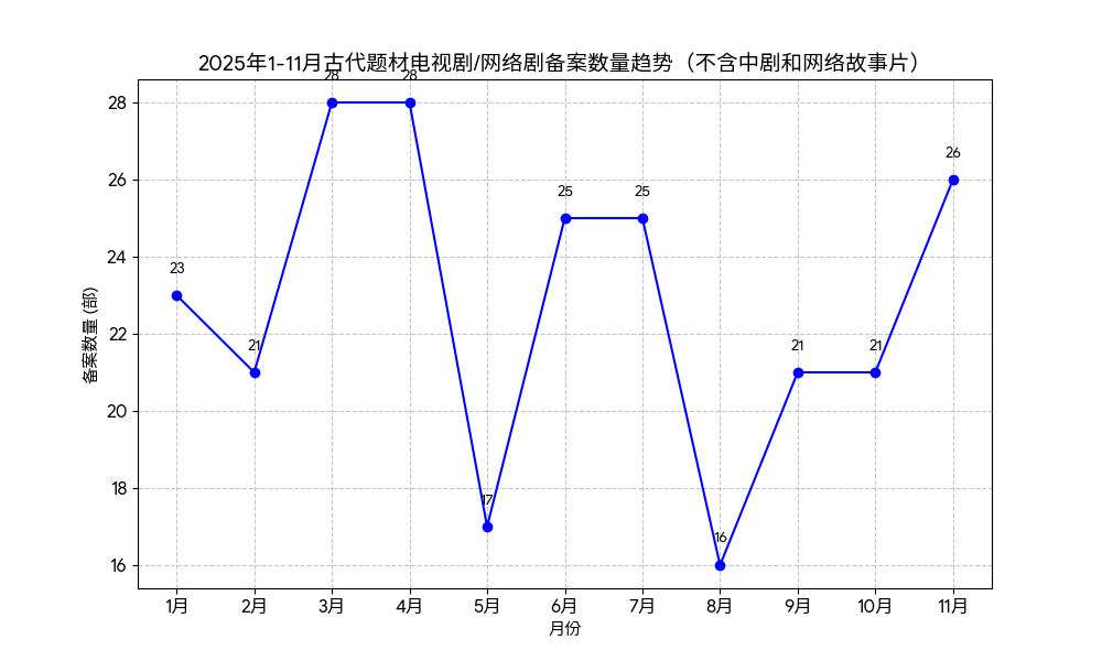 jrhz.info我们退而求其次,对2025年1月至11月电视剧和网络剧“古代题材”的备案数进行了梳理: