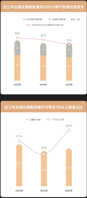 腾讯新闻最新发布的《2025腾讯娱乐白皮书》显示,古偶剧数量占比连续三年上升,但头部剧集热度连续三年下滑,豆瓣开分率同比下降。