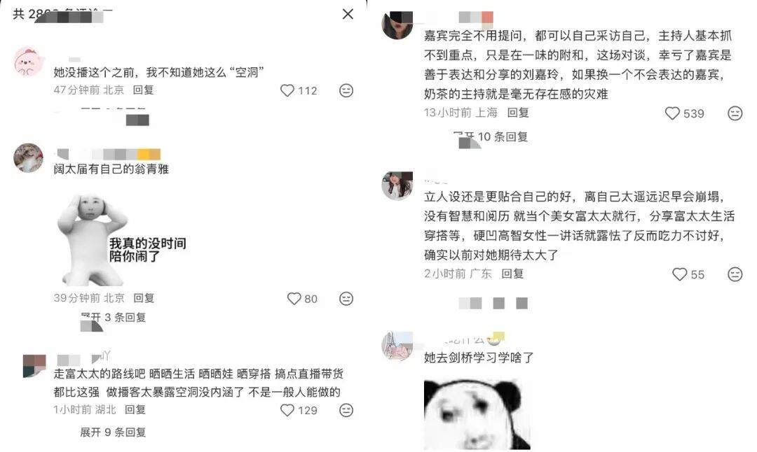 换言之,对于非专业媒体出身的章泽天而言,选择真正契合的嘉宾、找准对话的切口,就显得尤为重要。若双方背景、阅历或关注领域差异过大,缺乏真正的共鸣基础,对话就容易流于表面。例如,本期节目中刘嘉玲的阅历与体验,恐怕之于当下章泽天来说,还无法真正共情。对此,有网友调侃道,她或许更适合与刘强东、田朴珺、『陈都灵』等嘉宾展开对话。