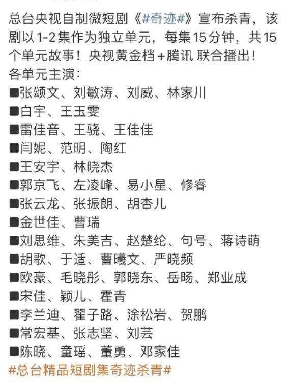 前不久,多位『明星』️发出消息,带“总台精品短剧集奇迹杀青”,看到这样的消息,大家才反应过来,原来短剧集《奇迹》杀青了,这部剧将围绕“奇迹”概念,多层次地全方位展示深圳这座奇迹之城,45年来波澜壮阔的发展画卷,以及未来的无限可能,我们将通过剧中鲜活的人物,共同了解城市的发展轨迹。