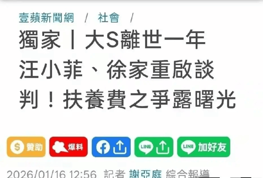 在1月16日,台媒曝出汪小菲和S家要重启谈判,可能会心平气和的谈一谈了,其实还是给脸不要脸,当初汪小菲愿意出745万来赡养S妈,结果还嫌少,最后不了了之,随着年纪越大也越思念大S,但又有点没脸见两个孩子,估计也想敲一笔汪小菲了,没必要撕破脸一分拿不到。