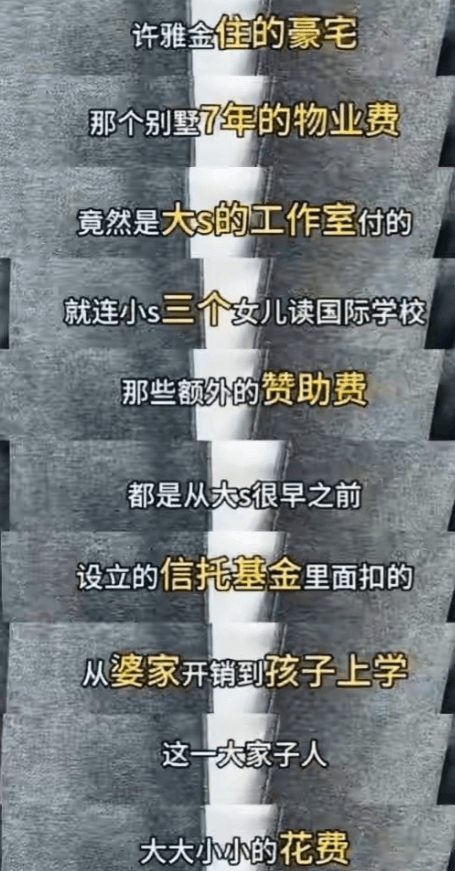 而有知情人透露大S多年来的财产流水账目真的是让人瞠目结舌,大S不仅要贴补自己的娘家,还要贴补给小S,替小S养家养小孩,怪不得许雅钧一直没有闹翻休了小S,现在看来大S是真的“扶娘家魔”,小S婆家一直看不上她没生儿子但也没让生了儿子的妾室进门,原因也是找到了。