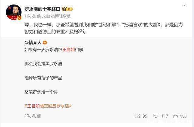 面对这种评论,罗永浩则直接转发并否认,他写道:嗯,我也一样。那些希望看到我和他‘世纪和解’、‘把酒言欢’的蠢X,都是因为智力和道德上的双重不及格。他的言辞依旧犀利,让网友们既惊讶又忍俊不禁。 事情的趣味性就在于,大家期待的同框大和解,在当事人眼中根本不可能实现。罗永浩和王自如的态度几乎一致:各过各的日子,而真正热衷热闹的,只是那些看客心态的『互联网』闲人。网络上的喧嚣,再精彩,也只是旁观者的娱乐而已。