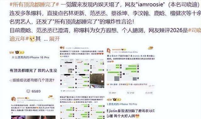 30岁,我把顶流都睡完了。 这一句话,像火箭一样把热搜炸得四散飞扬。凌晨两点,司晓迪的微博发布后,宛如往粪坑里投下了鞭炮,瞬间爆炸,满天飞的瓜皮引得无数围观。网友们一边骂她疯批,一边却忍不住手指往下滑——谁不想看那些顶流偶像的陨落呢?