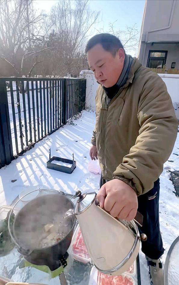阎鹤祥热衷做美食、吃美食,很会生活。2025年冬天,北京第一场雪来临后,他在自家院子里给妻子做涮羊肉。他还在院子里堆了两个小雪人,迎接宝宝的到来。