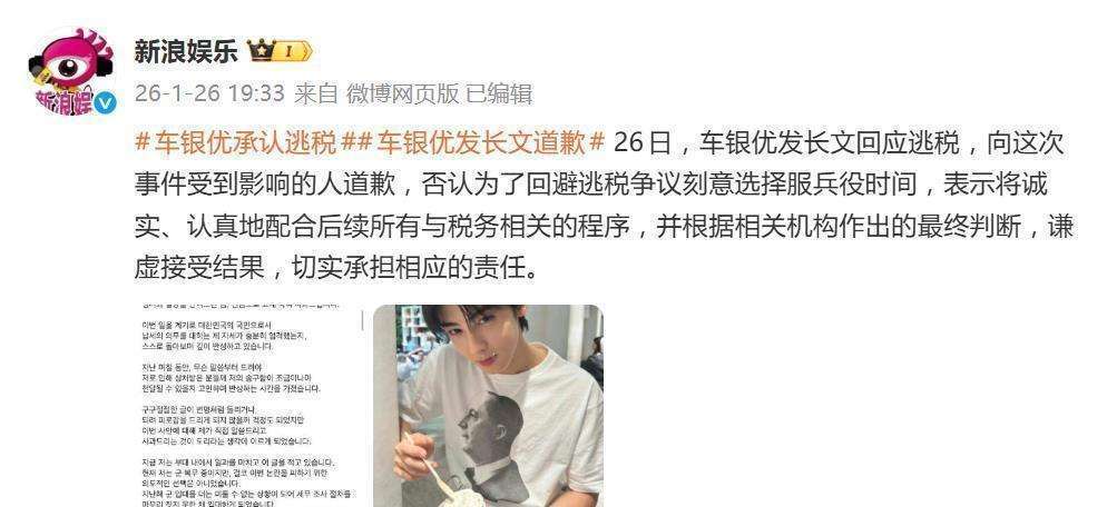 1月26日,韩国当红艺人车银优通过一封手写道歉信,瞬间引发了韩网的轩然大波。虽然他并不是因恋情丑闻而道歉,但这封信的内容却涉及到一宗震惊『娱乐圈』️的大案——他涉嫌逃税,金额高达200亿韩元(约合人民币1.08亿元)。这一数字创下了韩国艺人单个税务案件的最高追缴记录。