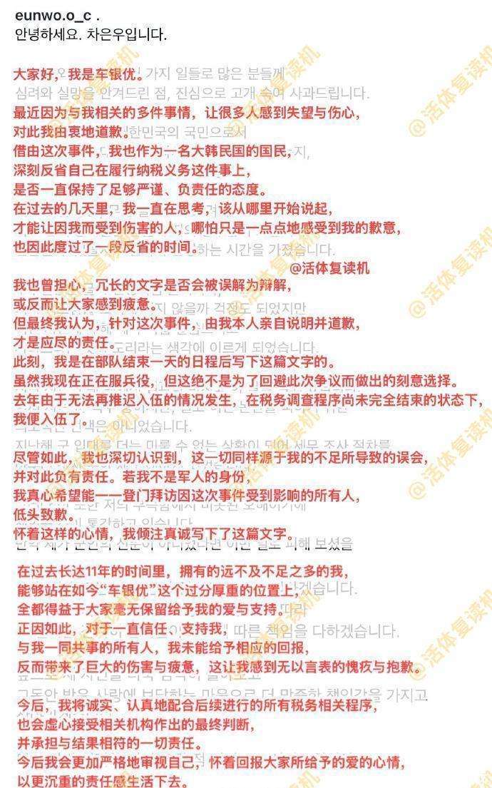 根据韩国国税厅的调查,车银优被指控通过其母亲名下的空壳公司,转移自己的演艺收入,涉嫌逃税金额达200亿韩元。与此同时,他所属的经纪公司Fantagio也因涉嫌协助虚开发票而被追缴82亿韩元。消息一经公布,舆论瞬间沸腾。这场事关200亿韩元的税务风波,几乎摧毁了车银优的公众形象,甚至可能让他面临职业生涯的重大危机。为了应对这一突如其来的打击,车银优决定在服兵役期间通过『社交媒体』发布这篇长文,以平息公众的愤怒。在信中,他多次提到责任与反省,语气显得格外低调和谦逊。他写道:对于因我而受伤的每一位,绝无任何辩解的空间。并表示将诚实配合税务调查,根据最终判定结果,谦虚接受并承担一切责任。