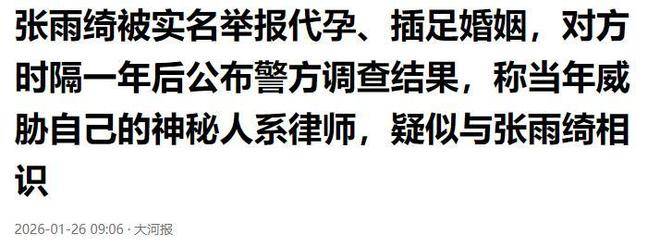 观众对艺人的要求不仅在于专业能力,私德与言行同样重要。『张雨绮』拥有出众的外形和不俗演技,却一次次被争议消耗好感。 此次事件,更触碰法律红线。如果规避生育的辛苦可以跨越底线,那么便是对生命的漠视,对法律的挑战。孩子不是商品,生命更不可交易。 目前,司法机关尚未进一步通报,『张雨绮』本人也未作正面回应。恩怨最终将如何收场,是『张雨绮』能拿出证据反击葛晓倩,还是葛晓倩开启新一轮爆料,仍待时间揭晓。 大河报2026-01-26报道称,『张雨绮』被实名举报代孕、插足婚姻,对方在时隔一年后公布警方调查结果,称当年威胁她的神秘人系律师,疑似与『张雨绮』相识。