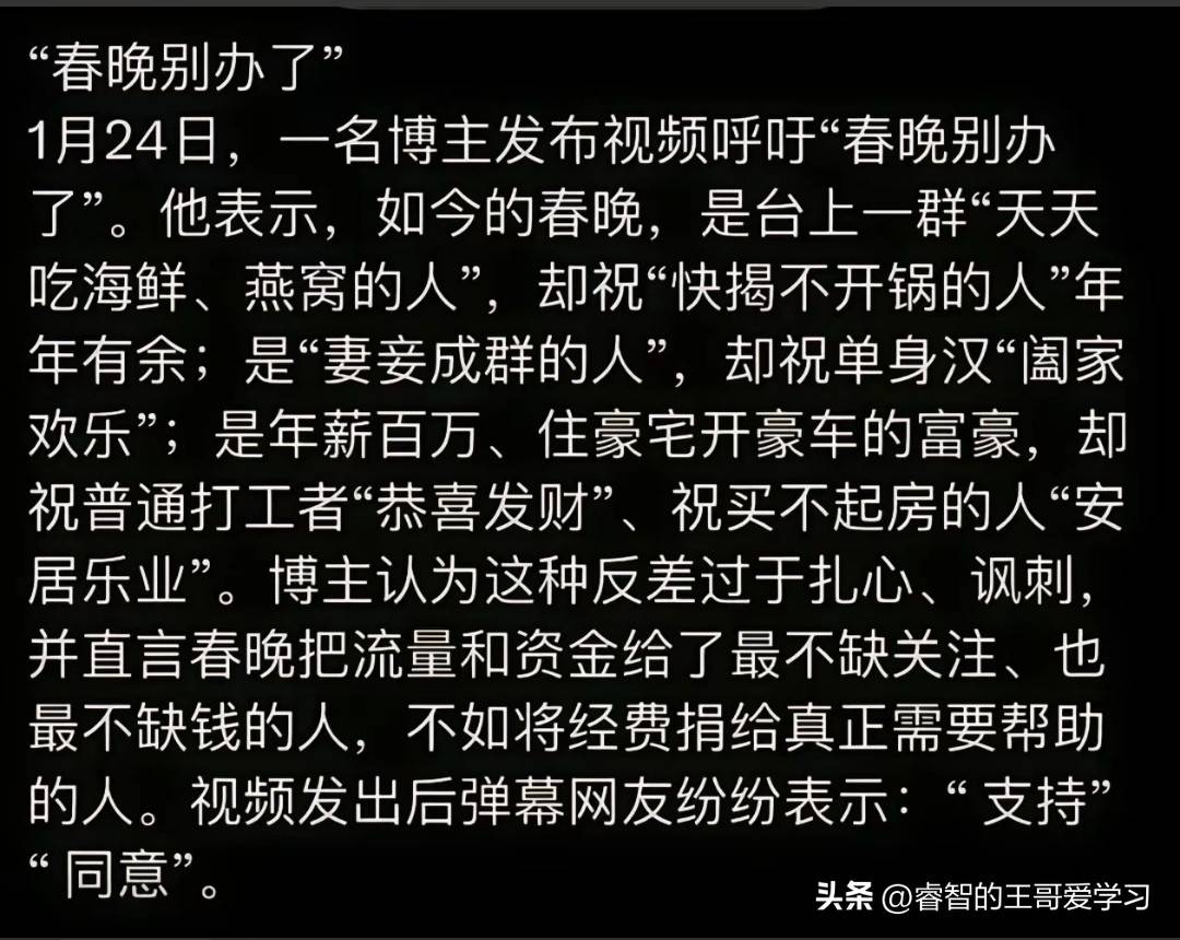 1月24日,一条名为春晚别办了的视频在网络上引发了极大的轰动,评论区瞬间被支持和终于有人说出心里话了的留言刷屏,春晚这一话题再度成为公众关注的焦点。在视频中,博主毫不留情地说道:一群天天吃海鲜、燕窝的『明星』️,祝那些捉襟见肘的人年年有余;那些妻妾成群的富人,祝单身汉阖家欢乐;年薪百万、住着豪宅的人,祝那些买不起房的人安居乐业。他直言不讳地提问:这样的祝福,听着不觉得讽刺吗?他接着质疑道,春晚将大把的流量和资源投入到那些已经不缺关注的『明星』️身上,不如将这些资金捐给那些真正需要帮助的普通百姓。这段话为什么能瞬间引发如此广泛的共鸣?原因很简单,它精准地触碰到了无数普通人心中的痛点。