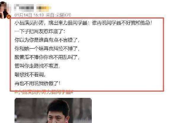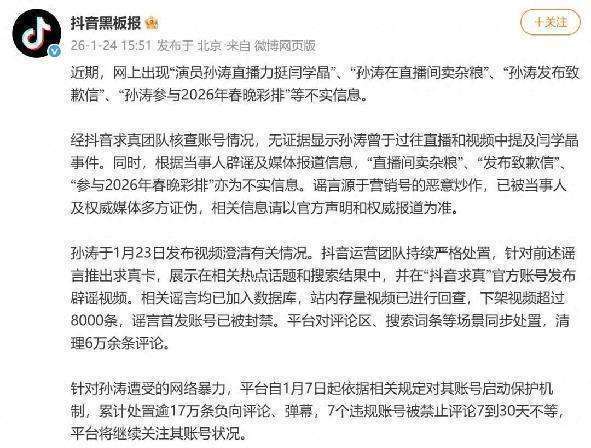 这位网红大妈的账号内容单调,主要是一些社会热点事件的评论。孙涛的谣言刚传出时,这位大妈就发声批评,视频标题甚至直呼孙涛在『直播间』力挺闫学晶。她指出,孙涛居然敢在这个时刻站出来支持闫学晶,简直是自讨苦吃,不分是非的典型。更让人不满的是,这位大妈作为一个拥有40万粉丝的网红,在没有核实真相的情况下,轻易就信了谣言,开口痛骂。她上传的视频播放量也颇为可观,给孙涛的名誉造成了不小的损害。 当孙涛公开澄清之后,这位大妈的视频评论区迅速变得沸腾,网友们纷纷指责她不加辨别地跟风,甚至劝她不要做听风就是雨的人。尽管如此,这位大妈在视频删掉后,依然没有反思,而是继续发布新内容。结果,她的评论区被网友们骂得更厉害。因为视频早已被网友们下载并传给了孙涛的律师团队,即使她删除了视频,也无法逃避法律责任。 1月24日下午,『抖音』官方回应称,他们已经对平台上的视频进行了全面排查,超过8000条散布谣言的视频已经被下架,涉事账号也已被封禁。平台同时清理了评论区和相关搜索词条,累计删除了超过6万条评论。 无论是闫学晶的口碑崩塌,还是孙涛为澄清谣言而深感苦痛,『娱乐圈』️的艺人都应当明白一个道理:想要走得长远,就必须珍惜自己的名声,言行要一致。希望孙涛能够挺直腰杆,运用法律手段维护自己的权益,也希望大家在看热闹时,别急着下结论。让消息冷静下来,了解真相,少一些无端猜测,理性看待每一个话题。