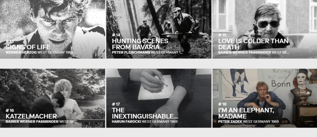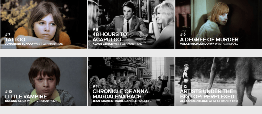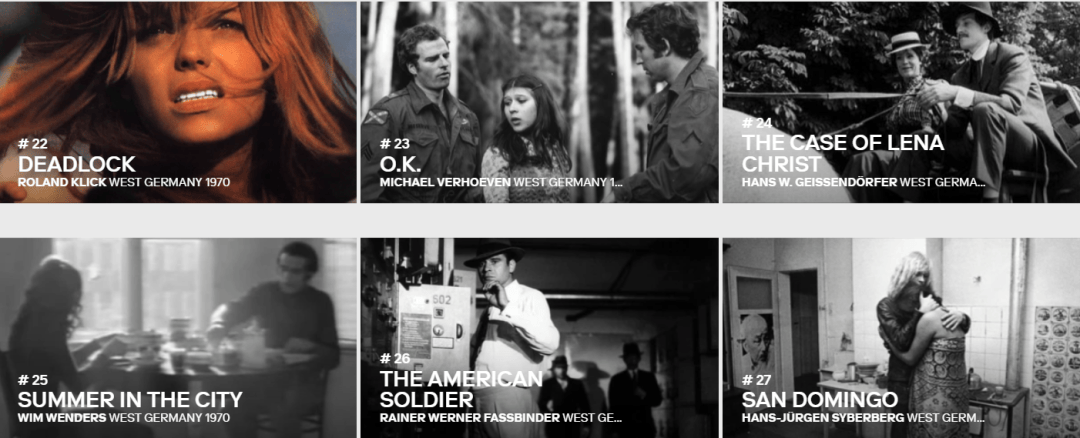 以下片单来源自《新德国电影:流离的影像》。尽管创作个性迥异,他们始终以历史反思和现实批判为共同美学追求,既探索电影叙事潜能,又将战后创伤与重建困境置于宏观历史视野,赋予影像哲学思辨深度,从而彻底颠覆了传统德国电影的保守形态,此片单收藏必备。