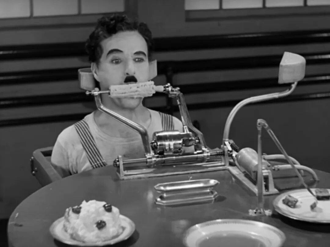 对“人被异化为机器”的警惕,在电影世界中早有历史寓言。1936年,卓别林的影片《摩登时代》里,普通人查理在工厂打工,他的工作是拧六角形的螺丝钉,这导致他染上了“看到任何六角形的东西都要拧一拧”的职业病。老板嫌工人们吃饭太慢耽误工作,发明了“喂饭机”,查理不得不拼命跟上机器的速度,疯狂咀嚼吞咽。