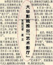 上世纪90年代,随着戏曲电视剧的兴起和电影市场的低迷,戏曲电影进入了发展平台期。针对这一现象,在本报1992年组织的繁荣首都舞台大家谈征文中,有读者提出应举办影片汇映活动培养新一代观众,让人们可以在影院随时欣赏中国的艺术瑰宝。(1992年7月3日《北京日报》7版,《应重视培养京剧观众》)1996年,北京大华影院推出“艺术影厅”,只放自成系列的特色电影,如戏曲电影专场。观众在这里能欣赏到京剧《秦香莲》《群英会》,评剧《花为媒》《刘巧儿》,越剧《梁山伯与祝英台》,黄梅戏《天仙配》,豫剧《朝阳沟》等许多经典戏曲电影。(1996年8月2日《北京日报》5版,《大华影院推出“艺术影厅”》)