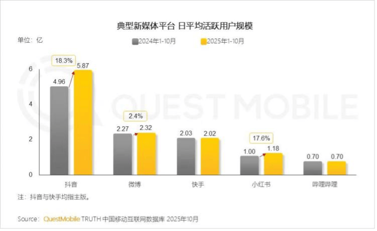 QuestMobile2025年10月数据显示,『抖音』、快手、微博、小红书、B站五大平台去重月活已达11.49亿,覆盖中国移动『互联网』核心人群,基本呈现一种零和竞争的态势。其中,2025年1-10月小红书DAU1.18亿,仍在“一亿”徘徊。同期,快手是2亿DAU、『抖音』则是5.87亿DAU。
