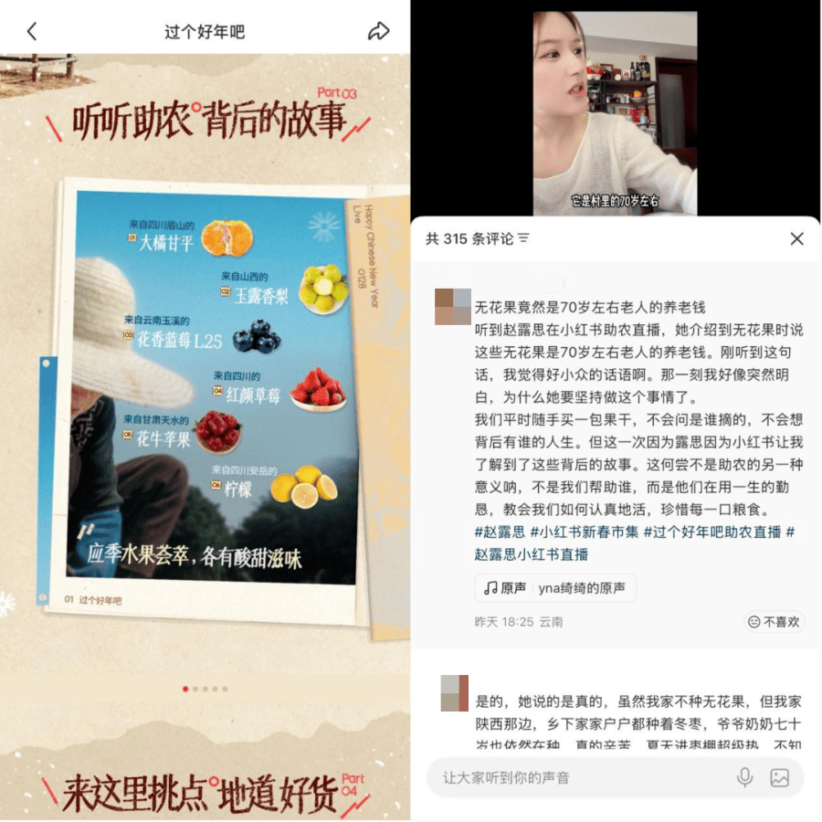 也因此,在这场『赵露思』的助农直播背后,小红书也显著标明着“更多助农买手持续加入中”,引导着更乡村、更草根的内容成为小红书的赋能新版图。