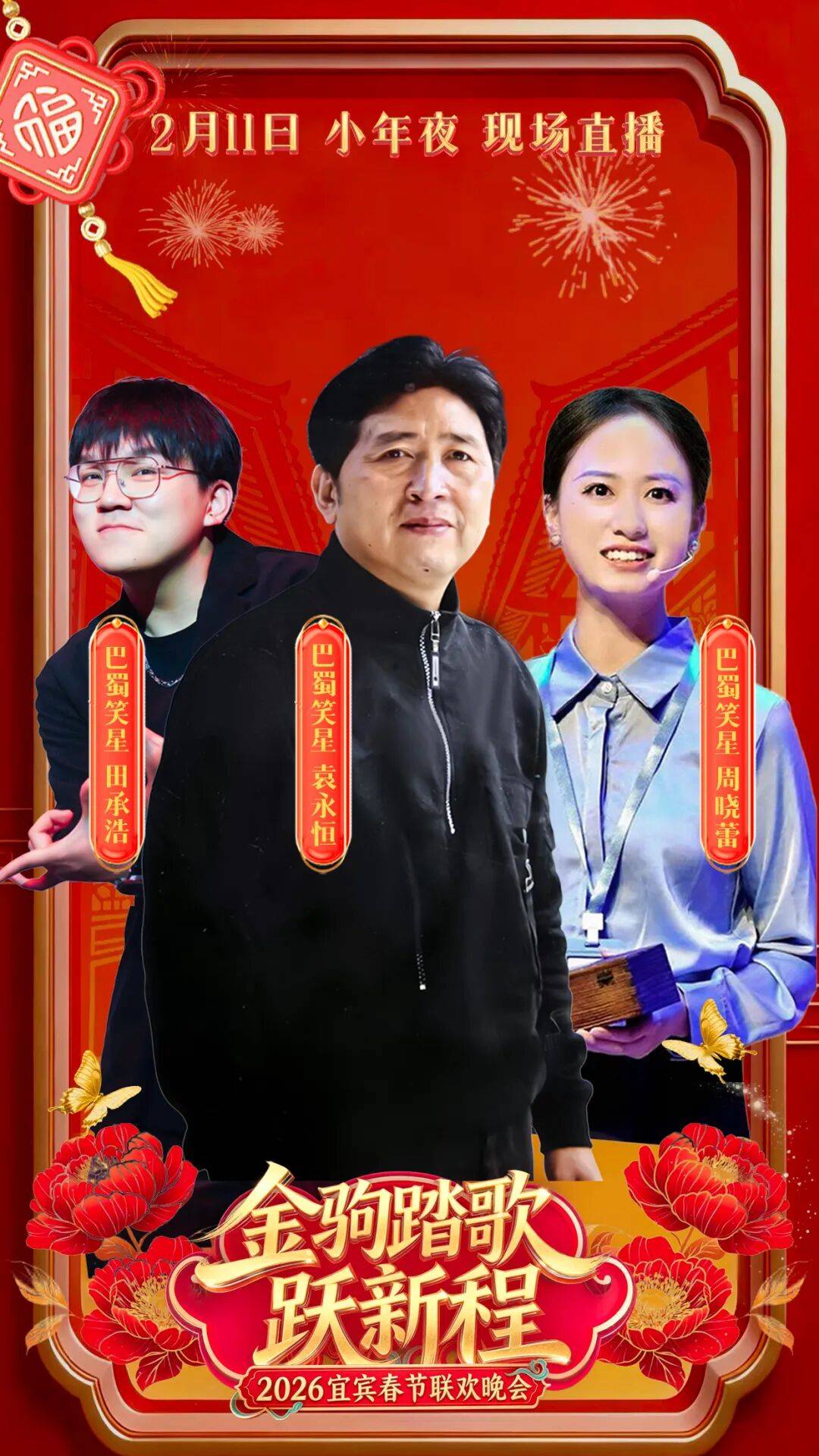 巴蜀笑星袁永恒、周晓蕾、田承浩爆笑加盟!他们皆是川渝喜剧舞台的实力笑匠,以川味笑料演活舞台。三人齐聚2026宜宾春晚,将与胖姐钟燕平联合送上新年欢笑舞台。