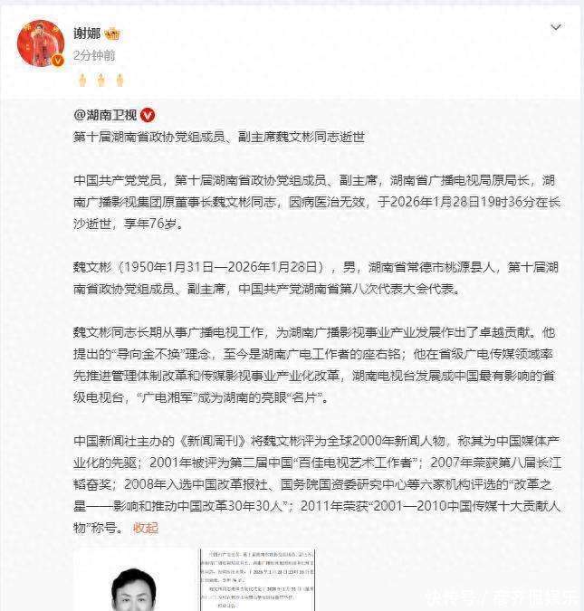 1月29日下午,『谢娜』在微博上写下了一句简短的话:魏老师,一路走好,并配了一张老照片。照片里的『谢娜』看起来年轻,站在穿着深色西装的中年男人旁边,笑容中带着几分拘谨。那条微博没有详细解释具体原因,但很快上了热搜。很多人翻看评论才知道,魏文彬应该已经去世,尽管官方并未发布正式的讣告,消息却从圈内人士那里悄悄传了出来。