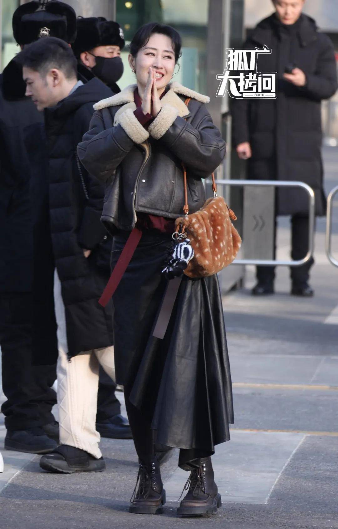 刘敏涛走的是酷帅皮衣风,从外套🧥到靴子都是和谐的,整体中规中矩,反倒是棕色毛绒单肩包能起到很好的点缀,加上了一些可爱气息。
