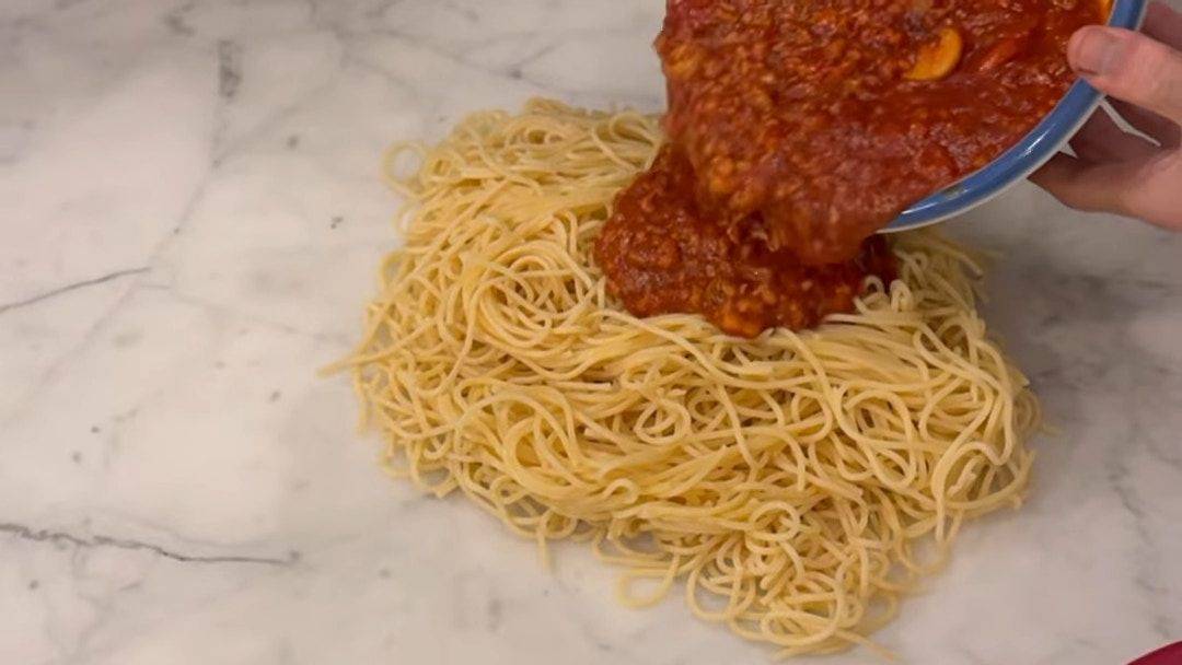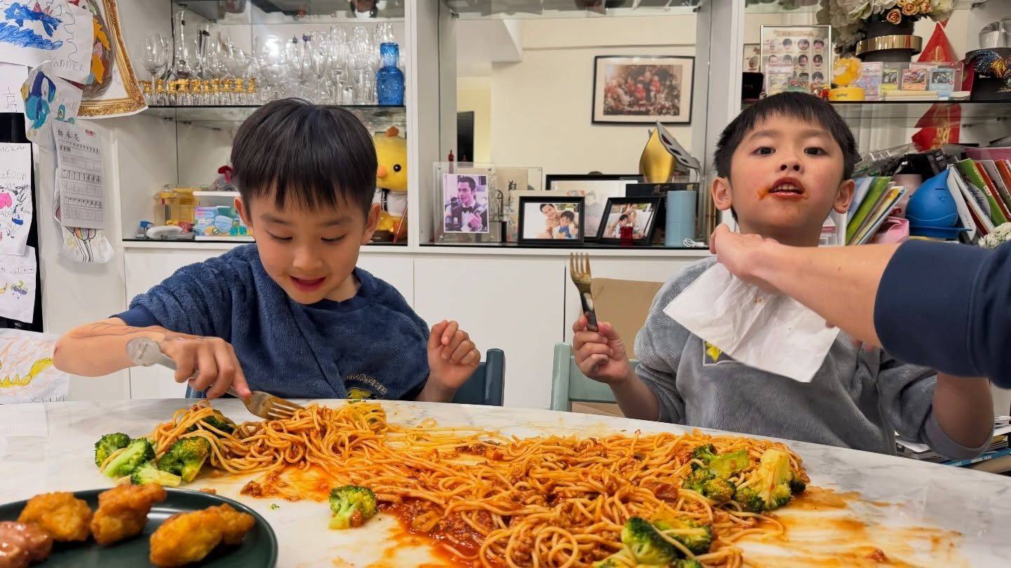 看到郑嘉颖和陈凯琳一家五口的晚餐方式,我第一反应是揉了揉眼睛——他们居然把肉酱意大利面直接倒在餐桌上,连盘子都省了!56岁的郑嘉颖忙着拌面,三个儿子围在旁边吃得手舞足蹈,这画面让不少网友直呼“太敢玩了”。