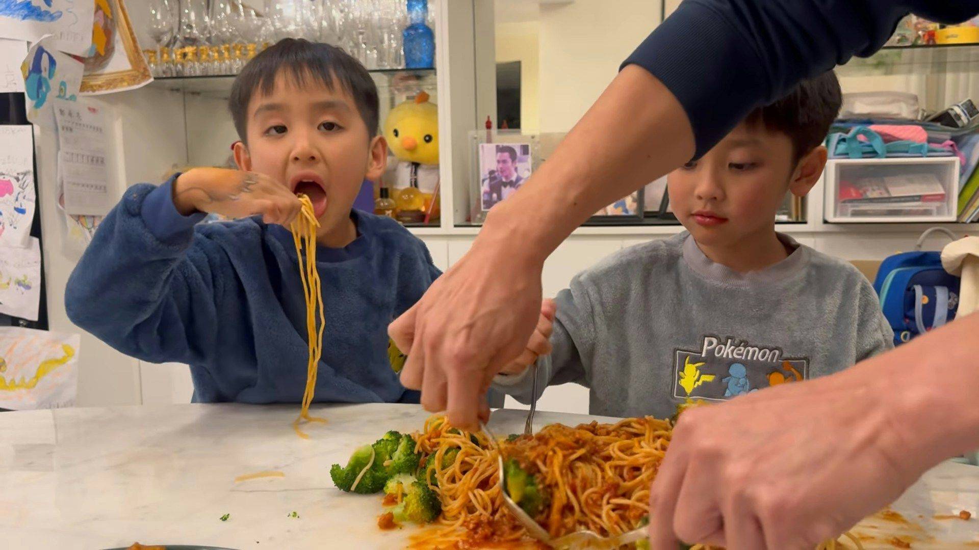 去年父亲节时,这对夫妻就试过同样的吃法。当时陈凯琳还在社交账号上写道,初次看到食物铺满桌时,自己也怀疑过是否卫生,孩子会不会抗拒。但看着孩子们兴奋的模样,他们决定“保持开放心态试试看”。如今再次上演“桌面盛宴”,两个大儿子已经熟练地趴在桌边大快朵颐,连坐在婴儿椅上的小儿子也分到了一碗。