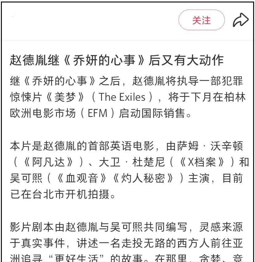 当时大家都以为他要和『赵丽颖』二搭,但是现在传出消息,这部《美梦》的女主角🎭️应该是吴可熙,这位女演员疑似传说中是赵德胤的前女友。