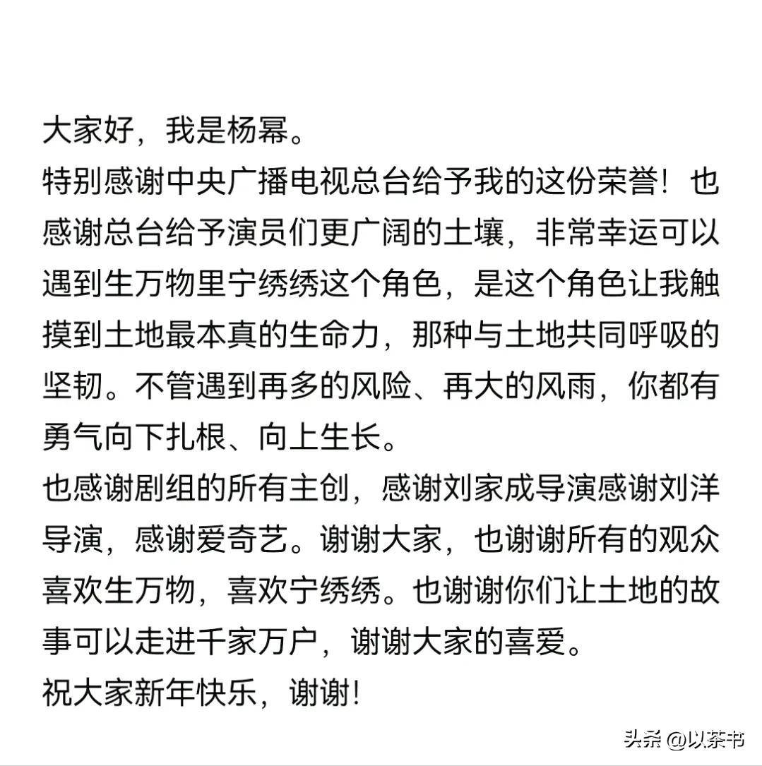 大家好,欢迎来到这一期的小书聊娱乐。在1月29日举行的第四届中国电视剧年度盛典上,『杨幂』成功摘得年度女演员奖,而吴越则未能如愿,成为了遗憾的陪跑者。对于很多人来说,这场颁奖典礼可以用一句话来概括:『杨幂』凭借《生万物》实现了转型,吴越则凭《沉默的荣耀》展现了她近年来最具口碑的演技,而这场对比的强烈性也引发了观众们的一片讨论。