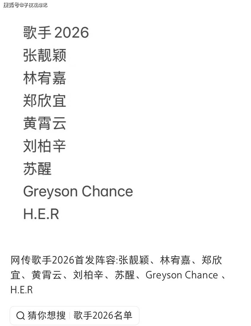最近,我看到了《歌手2026》的网上流传的名单,这时候,我忽然就觉得,不知不觉地,这档节目都成了『娱乐圈』️的重新走红工厂,你瞧瞧那份名单,张靓颖、林宥嘉、郑欣宜、黄霄云、刘柏辛、苏醒,还有外国歌手GreysonChance和HER两位,说它是竞演阵容,还不如说是一份用心谋划的热度复活名单。