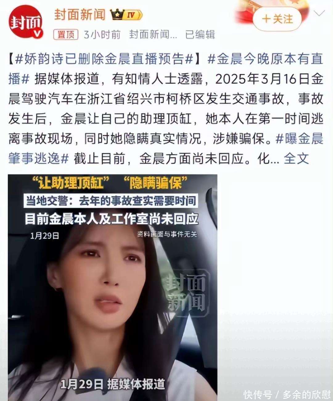 这件事一听就让人觉得荒诞。1月29日,当红女星『金晨』突然被曝出一则劲爆新闻:去年3月,她在绍兴某村开车出事,居然在事故发生后撂下车,和同车的人一起,悄悄跟着经纪人先溜了,留下了助理一个人在现场收拾残局。最后,这位助理甚至替『金晨』扛了所有责任,结果连保险公司都差点赔钱。