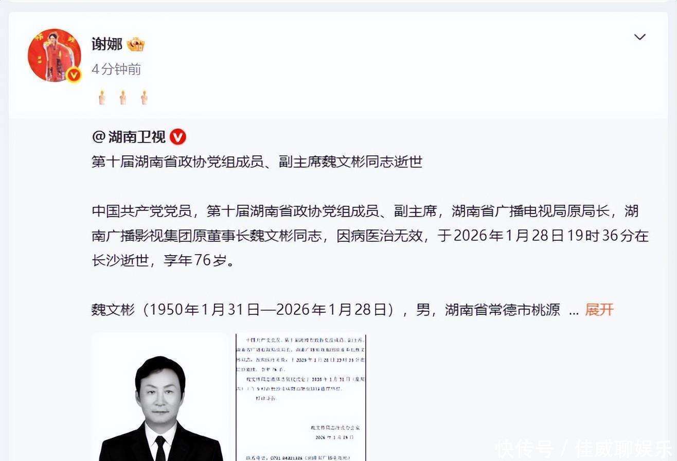 或许,有人会觉得娱乐博主谈悼念太轻佻,但其实不然。魏老用一生践行把快乐带给中国人,他让严肃的电视荧屏变得生动有趣,而『谢娜』则用自己的方式,把这份快乐传递了二十多年。这次『谢娜』的静音悼念,既是晚辈对前辈的敬重,也是快乐传承者对快乐缔造者的致敬。没有煽情的言辞,没有刻意的动作,但却比千言万语更动人。 据悉,魏文彬先生因病医治无效,于2026年1月28日在长沙逝世,享年76岁。遗体告别仪式将在1月31日举行。愿魏老一路走好,愿他留下的快乐基因能继续传递下去;也愿我们的太阳女神『谢娜』,能带着这份传承,继续给大家带来温暖与欢笑,别辜负前辈的期许,也别辜负我们那段快乐的青春。 最后,咱再唠一句:那些年守在电视前笑到打滚的日子,那些快本里的名场面,那些『谢娜』的搞怪瞬间,从来都不是凭空而来的。感谢魏老,给了我们一整个青春的快乐;也感谢『谢娜』,把这份快乐,好好地延续了下去。