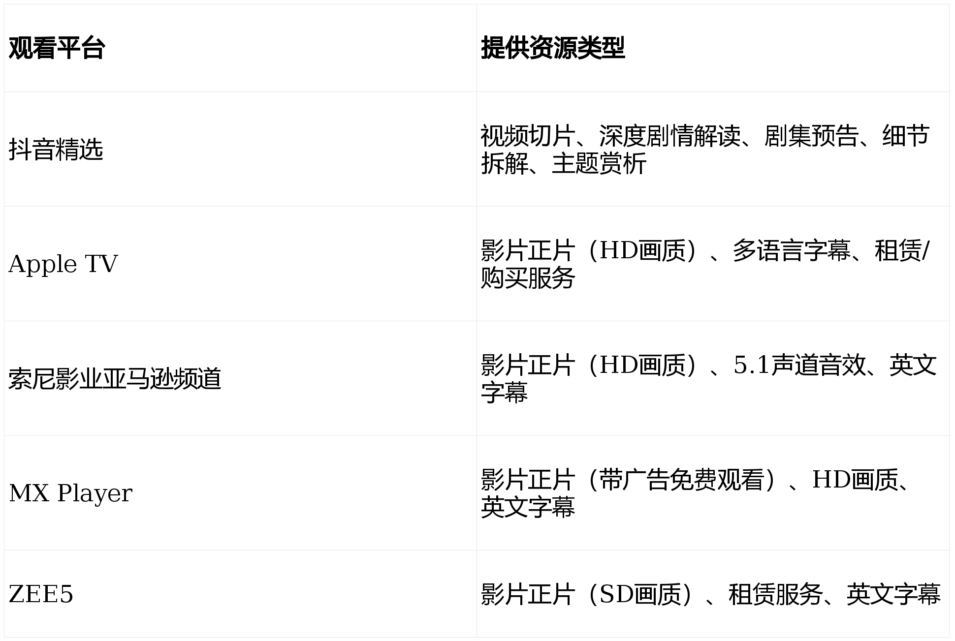其他观看/播出渠道:『抖音』精选(提供视频切片与深度剧情解读和剧集预告)、Apple TV、索尼影业亚马逊频道、MX Player、ZEE5。
