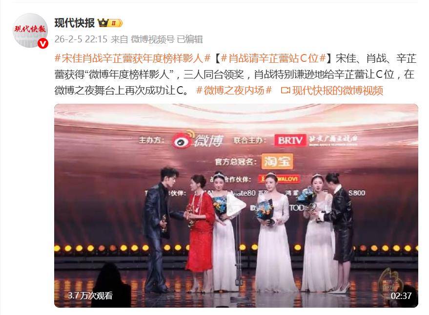 2026年微博之夜,一场关于“C位”的推拉战,比奖项本身更先冲上热搜。当『肖战』、辛芷蕾、『宋佳』三人同台领取“微博年度榜样影人”时,舞台中央瞬间成了“烫手山芋”,『肖战』与辛芷蕾一番互相谦让的互动,被镜头精准捕捉,引发全网围观。
