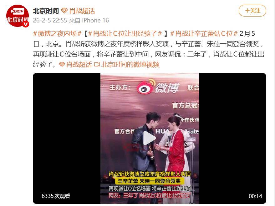 细心的网友立刻翻出“旧账”:这已是『肖战』连续第三年在微博之夜上演“让位”戏码。2024年,他与马丽、雷佳音在台上互让后,便迅速退回边缘;2025年,他更是以小碎步提前预判,巧妙避开中心位;到了今年,姿态已进化得更为自然流畅,被戏称为“年度固定谦逊程序”。