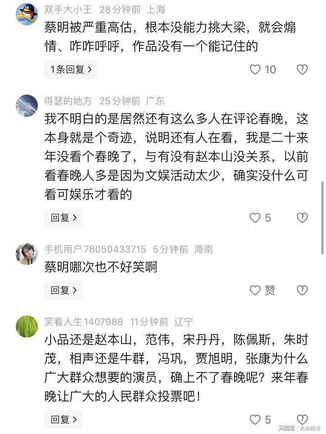 对于这些声音,部分网友提出了对蔡明的质疑,认为她的表演能力被过分高估了。有人觉得蔡明只会煽情和做哗众取宠的表演,至于她的作品,也没有一部给人留下深刻印象的。而另外一部分网友则表示,他们不太理解为何大家还会对春晚如此关注。毕竟,这个节目本身就已经成为了一个奇迹,至少说明了还是有不少观众在看。事实上,这些网友透露,他们已经有二十多年没有再观看春晚了,并且这一切和『赵本山』是否出席春晚并没有关系。过去,大家看春晚,主要是因为那时的文娱活动太匮乏,真的没有什么可以娱乐的选择。那个时候,小品的主力演员大多是『赵本山』、范伟、宋丹丹、陈佩斯、朱时茂等人,至于相声领域的牛群、冯巩、贾旭明、张康这些老面孔,才是真正吸引观众的喜剧力量。可如今,为什么这些受人喜爱的演员却很难再上春晚了?有网友提议:明年的春晚,不如让广大人民群众来投票,选出他们最喜欢的演员和节目吧!