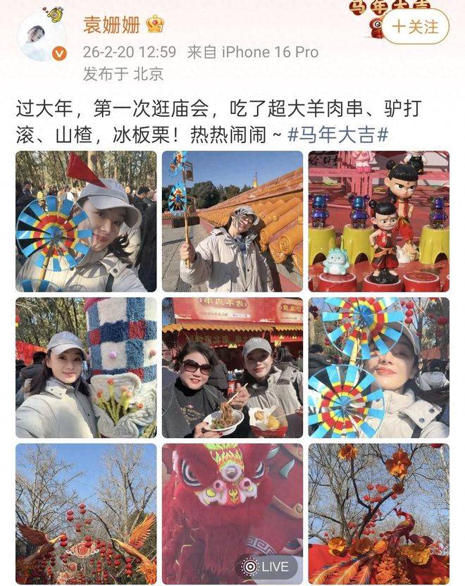 谁能想到,快四十岁的袁姗姗居然是第一次逛庙会?2024年大年初四(2月20日),她兴奋地在『社交平台』上晒出了几张和父母逛庙会的照片,配文写道:过大年,第一次逛庙会,吃了超大羊肉串、驴打滚、山楂、冰板栗!热热闹闹~马年大吉。她还加上了几个表情符号,心情看起来极好。评论区迅速被网友的接地气和好羡慕刷屏——这姐也太不把自己当『明星』️了吧?