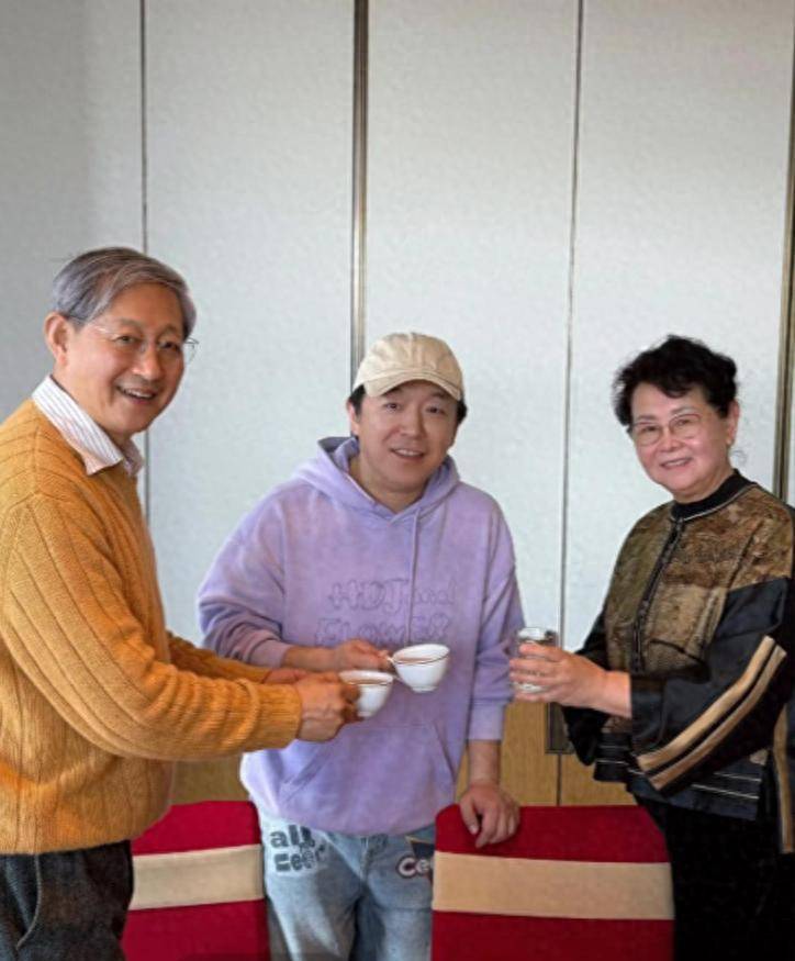 『黄渤』的亲姐姐也参加了这场家宴,两姐弟站在一起,简直是同一个模子里出来的,长得太像了。那天『黄渤』穿了一件显眼的紫色卫衣,整个人看起来既喜庆又充满了活力,仿佛紫气东来,浑身上下都是好运气,精神头十足,完全看不出他的年龄。