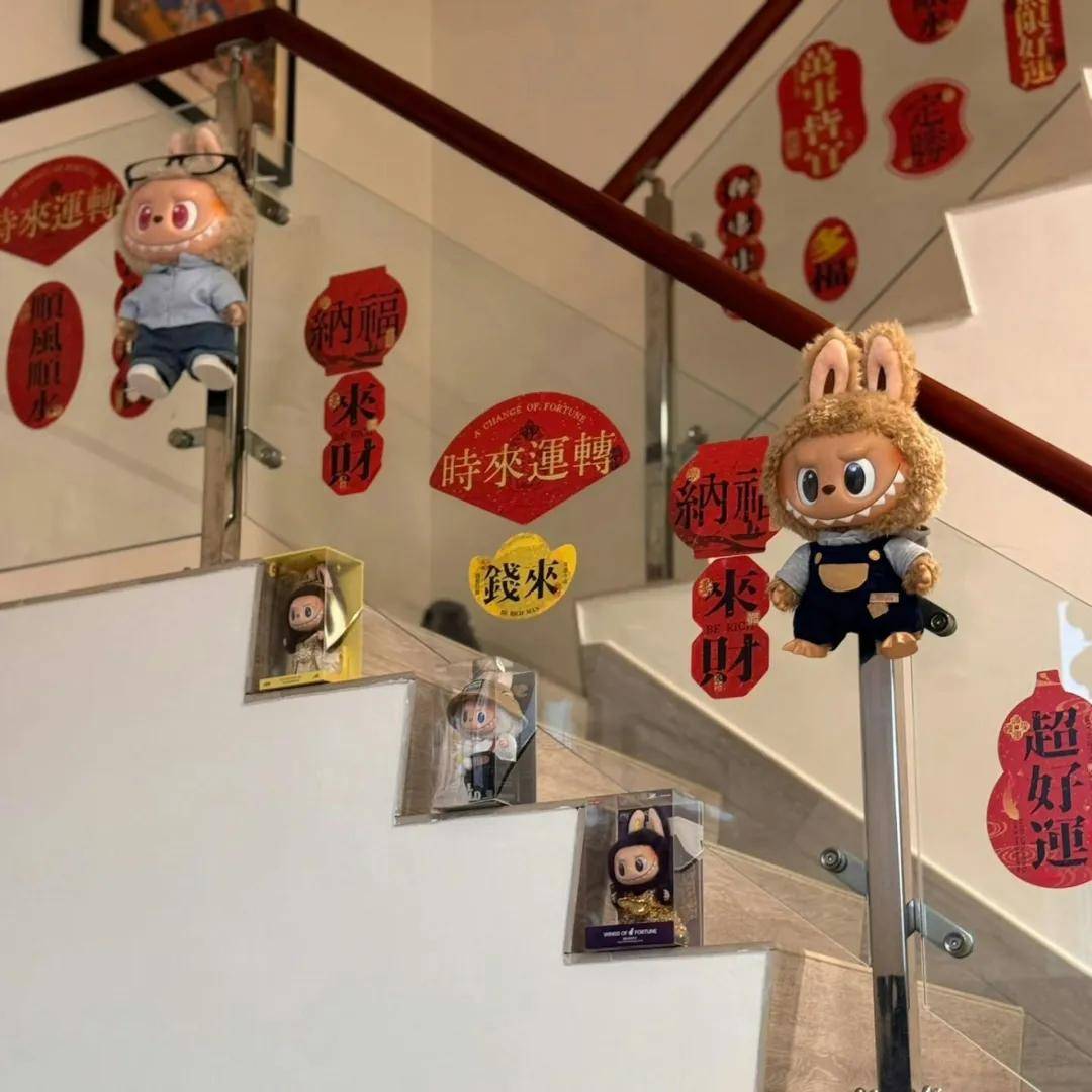 屋內的樓梯兩側除了貼了揮春之外,還掛上了多個不同造型的labubu,樓梯邊亦擺放了幾隻labubu,相當有心思!(IG@6wing_fama)