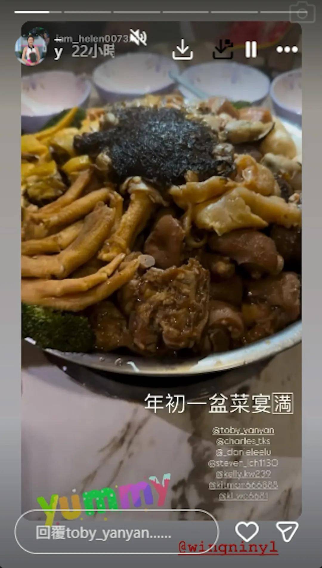 陳庭欣同師弟妹渡歲齊嘆盆菜。(ig@toby_yanyan)