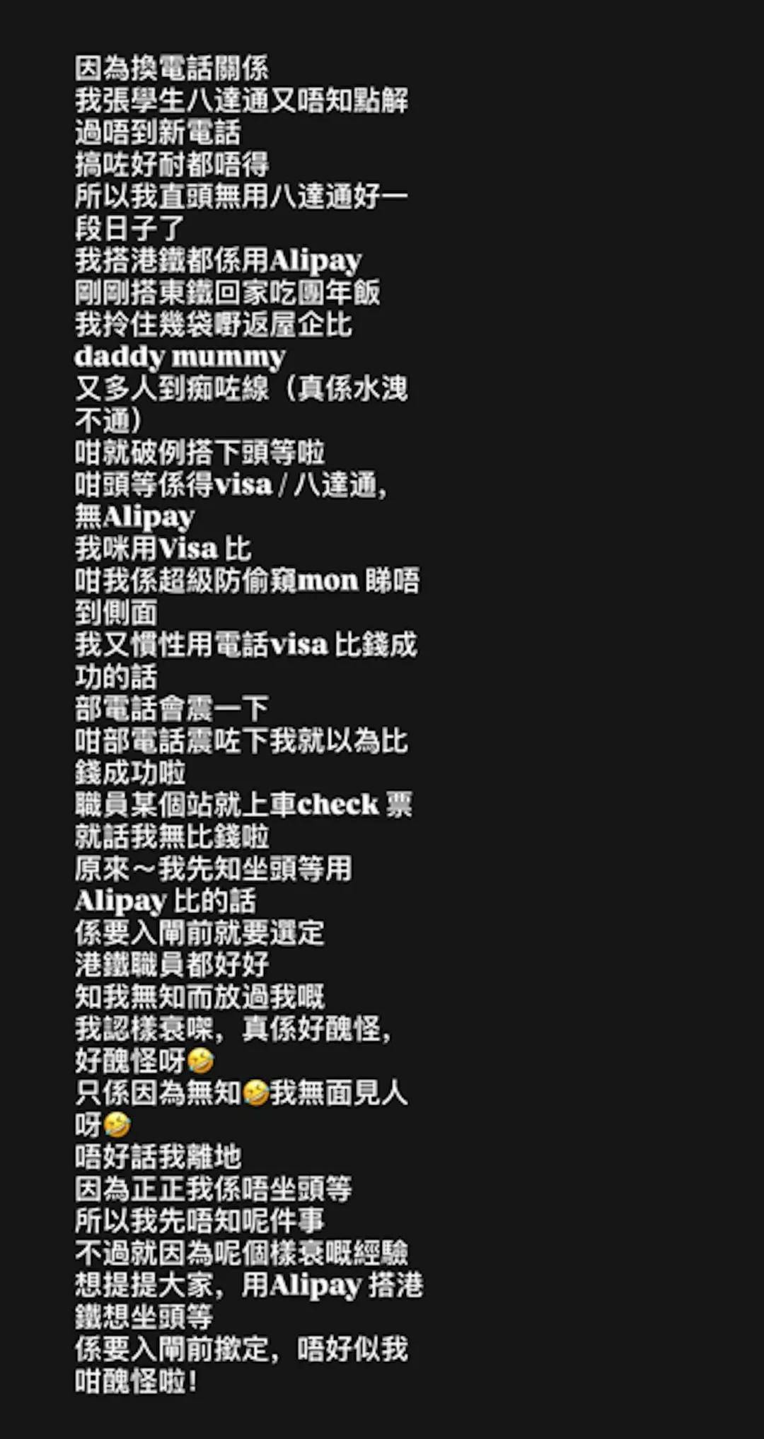 梁敏巧撰長文解釋坐「霸王車」經過。(ig@maggiemanhau)